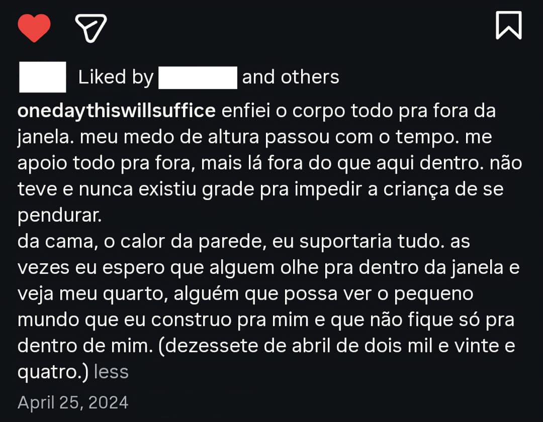 mesmo que só por um momento, me visse despertar também. não era só desejo de ser visto, mas desejo de ser visto de forma tão cotidiana que acabasse assim.